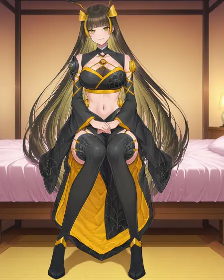 Mitsu_the_Insect_Ninja, 1girl, long hair, solo, very long hair, multicolored hair, ponytail, large breasts, high heels, yellow eyes, smile, bangs, black hair, blunt bangs, blonde hair, brown hair, shirt, pants,