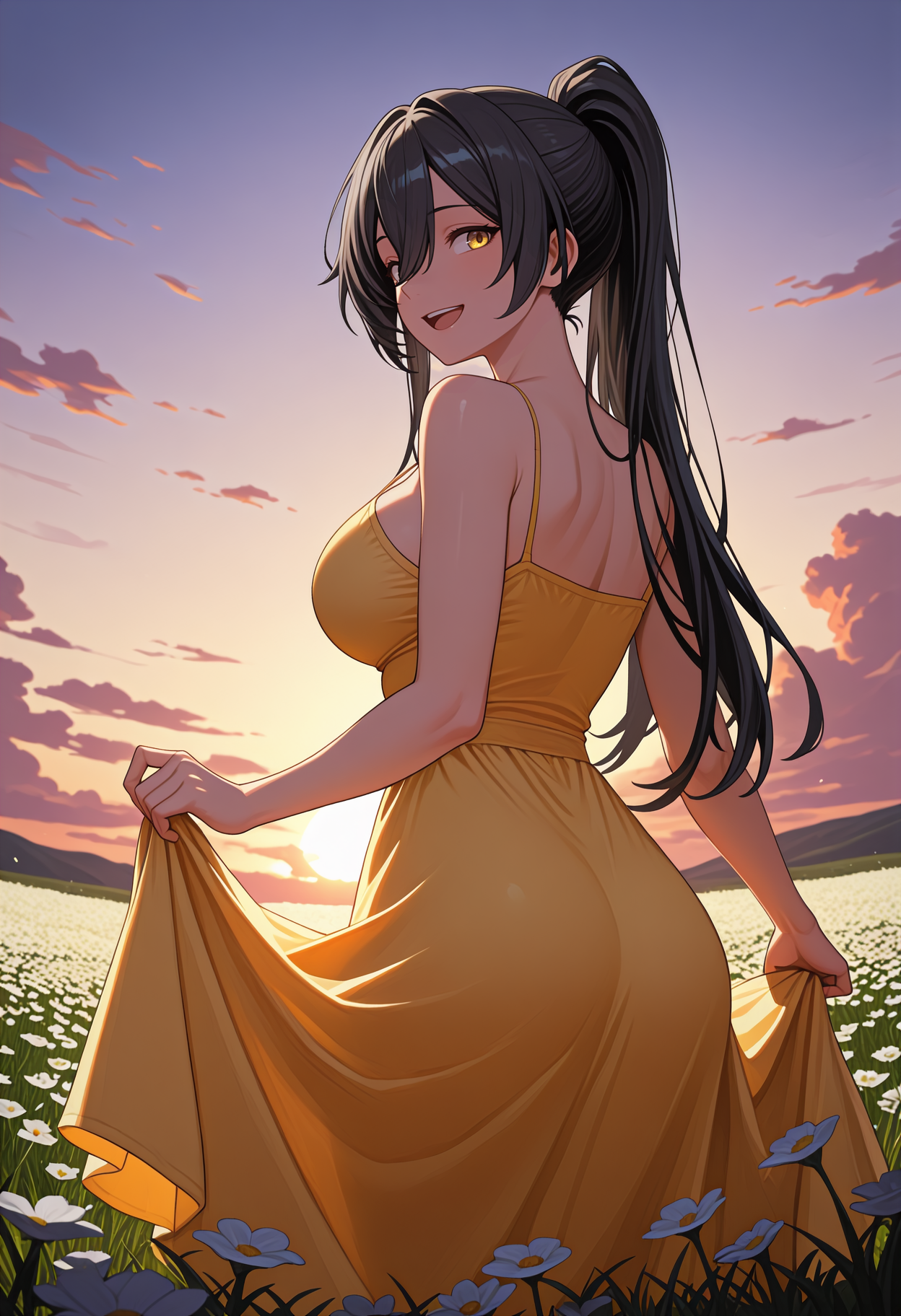 외모: long hair, black hair, hair between eyes, high ponytail, yellow eyes, large breasts