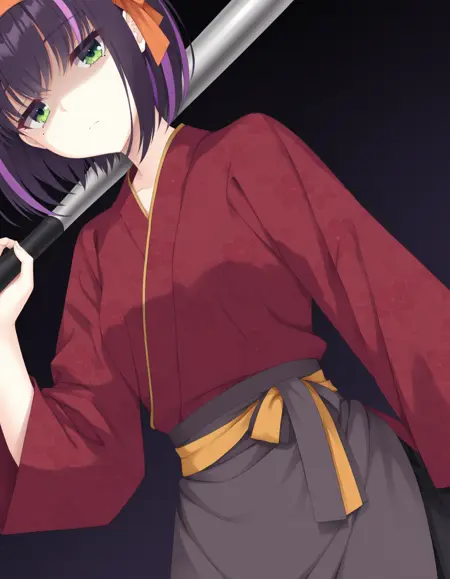 nabarianju, 1girl, solo, short hair, purple streaked hair, green eyes, mole under eye, orange bow headband, red kimono shirt, floral print, black pleated skirt, grey apron, clothes writing, writing on apron, yellow obi, black strappy sandals, bare legs