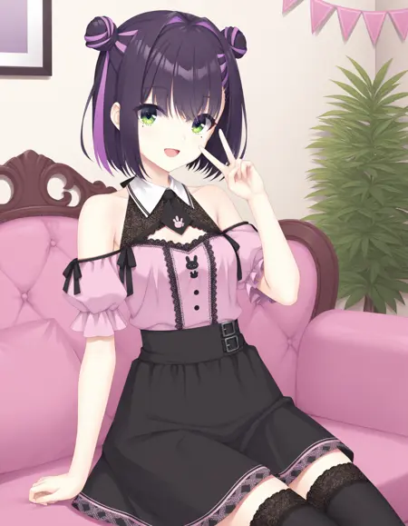 nabarianju, 1girl, solo, short hair, black hair, purple streaked hair, double bun, green eyes, mole under eye, black necktie, bunny print, pink off-shoulder shirt, puffy sleeves, off shoulder, white collar, black flower lace halterneck, black ribbon, black belt, belt buckle, black high waist skirt, black thighhighs, lace trim thighhighs, bows on shoes, lace trim, small breasts