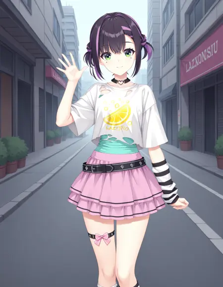 nabarianju, 1girl, solo, short hair, black hair, purple streaked hair, green eyes, mole under eye, low double bun, white ripped shirt, crop top, short sleeves, print shirt, lemon print, clothes writing, light green vest, pink pleated skirt, tiered skirt, black studded belt, asymmetrical legwear, single striped arm warmer, single bare arm, single striped loose socks, single black loose socks, pink bow thigh ring, black buckled footwear, heart choker, small breasts