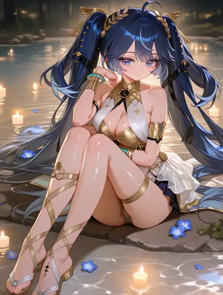 iuno \(wuthering waves\), official outfit, breasts, jewelry, bangs, gold hair ornament, bare shoulders, bracelet, underwear, gold choker, gold bra, thighlet, white panties, sandals, gladiator sandals, gold footwear