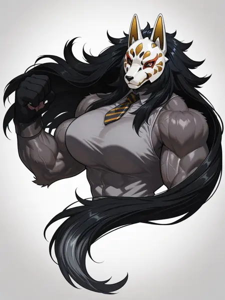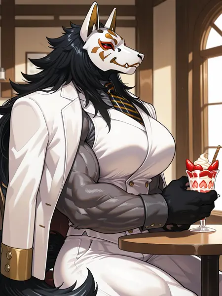外观/服装: 狼女,狐狸面具,女性兽人,肌肉女性,彩色巩膜,多色眼睛,黑发,长发,黑毛,白色夹克,夹克搭在肩上,白色背心,灰色衬衫,条纹领带,腕部护具,爪子,大腿绑带,白色长裤,狼尾,蹄足,