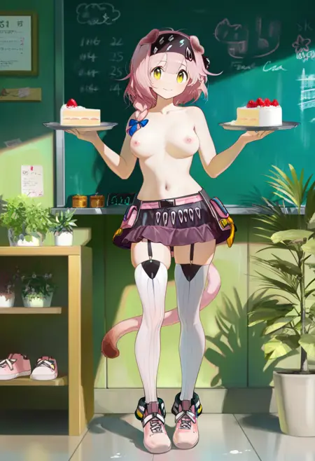 半裸露: 1girl(明日方舟 Goldenglow 内衣,Arknights_Goldenglow,长发,乳房,注视观众,微笑,短发,刘海,短裙,过膝袜,肚脐,手持,动物耳朵,中等乳房,闭嘴,乳头,站立,锁骨,尾巴,全身,黄眼睛,粉发,百褶裙,发箍,食物,鞋子,猫耳,超短裙,腹部,白过膝袜,绝对领域,猫尾,双手举起,内裤印痕,上身裸露,植物,猫娘,托盘,粉裙,蛋糕,标牌,粉鞋,盆栽,手持托盘,黑板,Arknights_Goldenglow 黄眼睛,Arknights_Goldenglow 粉发,Arknights_Goldenglow 猫耳,Arknights_Goldenglow 猫尾,完美双手)