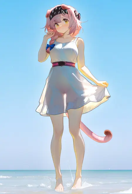 连衣裙: 1girl(明日方舟 Goldenglow 替代服装,Arknights_Goldenglow,长发,注视观众,脸红,刘海,连衣裙,蝴蝶结,动物耳朵,露肩,闭嘴,站立,锁骨,尾巴,全身,黄眼睛,粉发,辫子,发带,赤脚,无袖,猫耳,手举起,白连衣裙,猫尾,裸臂,裸腿,单辫,无袖连衣裙,蓝蝴蝶结,黑发箍,蓝丝带,猫娘,提裙,透视轮廓,Arknights_Goldenglow 黄眼睛,Arknights_Goldenglow 粉发,Arknights_Goldenglow 猫耳,Arknights_Goldenglow 猫尾,完美双手)