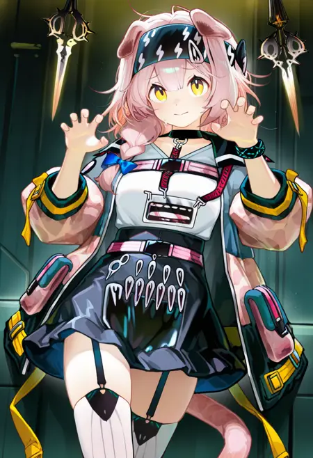 官方服装: 1girl(明日方舟 Goldenglow 官方服装,Arknights_Goldenglow,长发,乳房,注视观众,刘海,短裙,上衣,过膝袜,长袖,蝴蝶结,动物耳朵,中等乳房,闭嘴,夹克,尾巴,黄眼睛,白上衣,粉发,辫子,发带,半身像,发箍,敞开衣物,猫耳,黑裙,露肩,白过膝袜,敞开夹克,绝对领域,黑夹克,猫尾,吊袜带,蓝蝴蝶结,黑发箍,猫娘,多色服装,高腰裙,敞开外套,爪子姿势,粉夹克,工牌,剪刀,感染监测器(明日方舟),多色夹克,挂绳,双色夹克,Arknights_Goldenglow 黄眼睛,Arknights_Goldenglow 粉发,Arknights_Goldenglow 猫耳,Arknights_Goldenglow 猫尾)