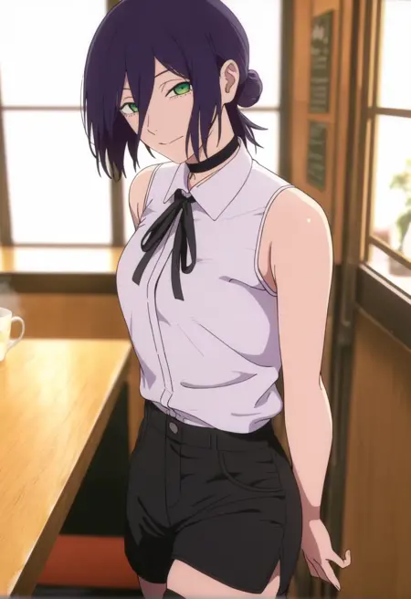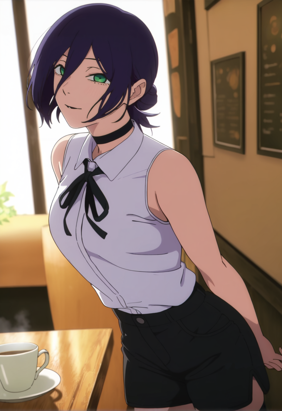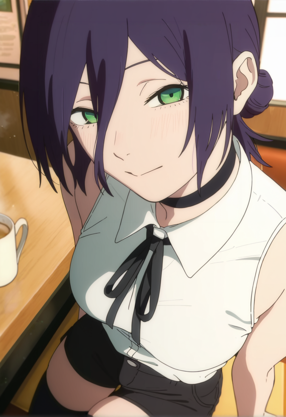 | トレーニングワード | RezeV2, 1girl, solo, short hair, purple hair, medium hair, single hair bun, medium breasts, green eyes,コピーしました! white shirt, collared shirt, choker, black thighhighs, sleeveless shirt, short shorts, neck ribbon, black ribbon, black choker, black shorts, shirt tucked in, side slit shorts,コピーしました! white thighhighs, bra, white panties, black choker, underwear only, lingerie, white bra, elbow glovesコピーしました! |