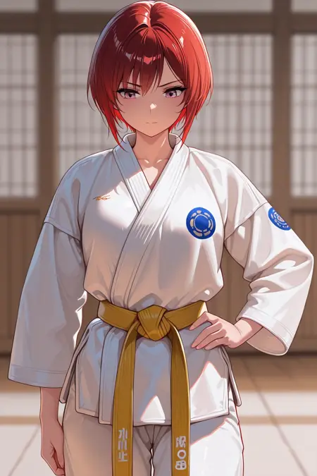 masterpiece, best quality, dobokITF, dougi, taekwondo red black belt, dobok Korean Flag, 1boy, male focus, solo, hand on hip, confident expression, standing, depth of field