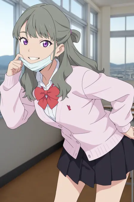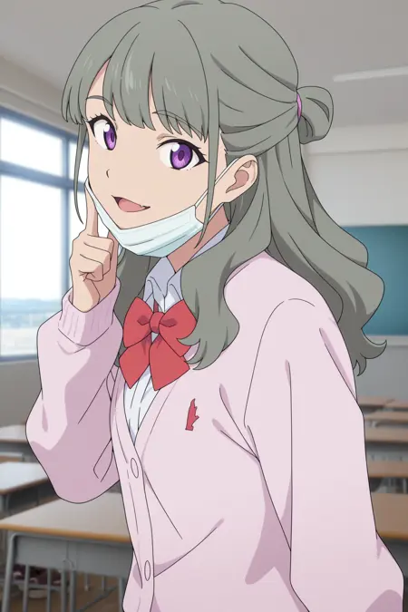 ranka, long hair, grey hair, half updo, hair tie, fanged bangs, choppy bangs, purple eyes, surgical mask, long sleeves, pink cardigan, white shirt, collared shirt, red bowtie, black skirt, pleated skirt, purple socks, kneehighs, brown footwear, loafers
