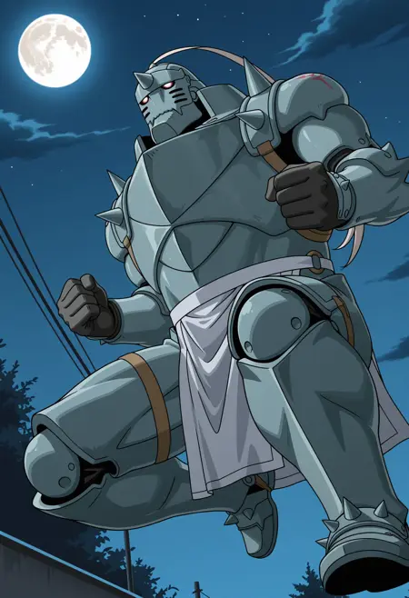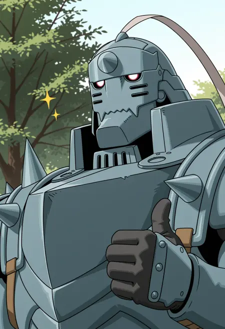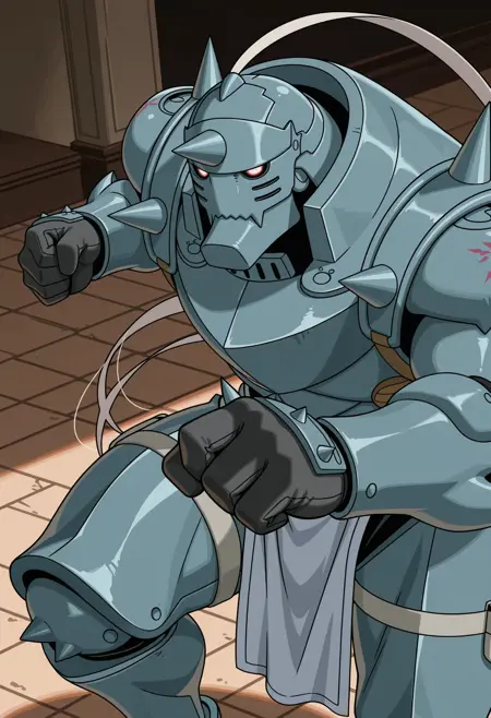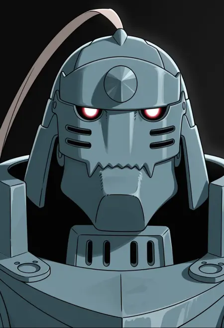 提示词:alphonse_fmab, 1boy, solo, armor, full armor, helmet, shoulder spikes, red eyes, flamel symbol, pelvic curtain, ahoge