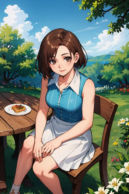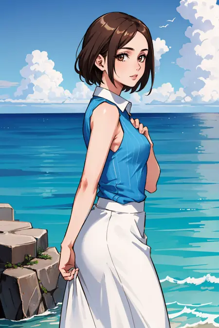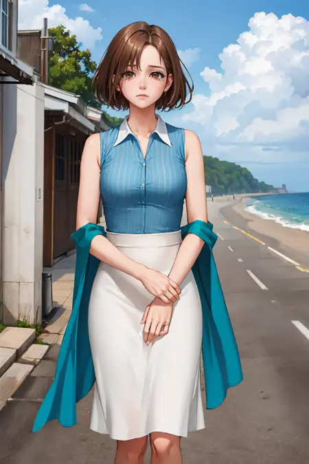 彼女の代表的な外見を再現するには、 "blue shirt, sleeveless, green shawl, white skirt" を追加してください。
