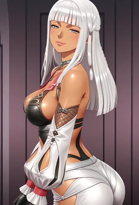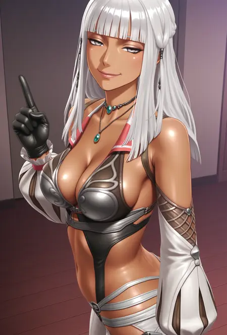 fsct_(ge), 1girl, solo, 성숙한 여자, MILF, 큰 가슴, 큰 엉덩이, 검은 피부, 검은 피부를 가진 여자, 흰색 머리, 긴 머리, 회색 눈, 둔한 앞머리, 목걸이, 보석, 노출된 복장, 가슴 노출, 배꼽, 분리된 소매, 볼륨 있는 소매, 검은 장갑, 하이레그, 원피스 속옷, 허리 가방, 백팩,