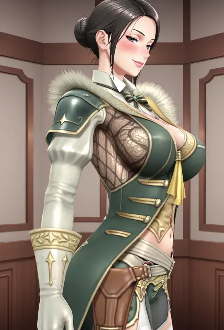 fmus_(ge), 1girl, solo, 成熟女性, milf, 大乳房, 大屁股, 黑发, 短发, 额头, 分开的刘海, 单发髻, 化妆, 粉色嘴唇, 领结, 围巾, 毛皮镶边, 深V领, 肩甲, 夹克, 护甲, ((黑色渔网袜)), 黑色渔网侧乳, 渔网背部, 手套, 肚脐, 腰带, 腰带包, 短裤, 白色过膝袜, 绝对领域, 高跟鞋
