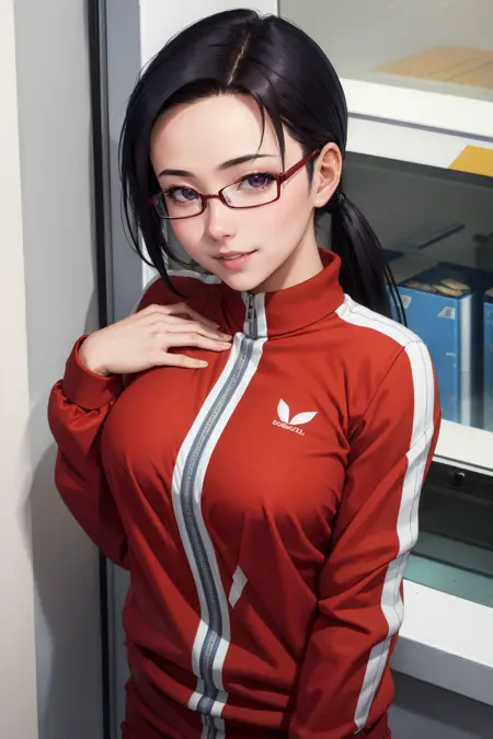 그녀의 전형적인 외모를 위해 "안경, 트랙 재킷, 빨간 바지"를 추가하세요.