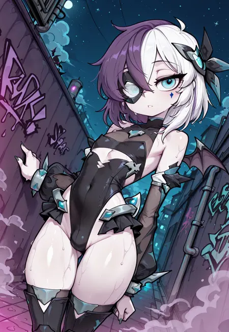 "Miko Veyra 在夜生活区被传为既是活生生的诱惑,又是危险的撩拨者。他那双色头发、乳胶光泽和意味深长的微笑,从不低调——他渴望成为焦点。传说他的姓氏“Veyra”源自一个古老词汇,意为扭曲或弯曲——这恰如其分,因为他热衷于扭曲人心、规则与道德。无论他是个被诅咒的凡人、化为人形的灵魂,还是一个毫不羞耻、热爱聚光灯的 femboy,没人能确定。"