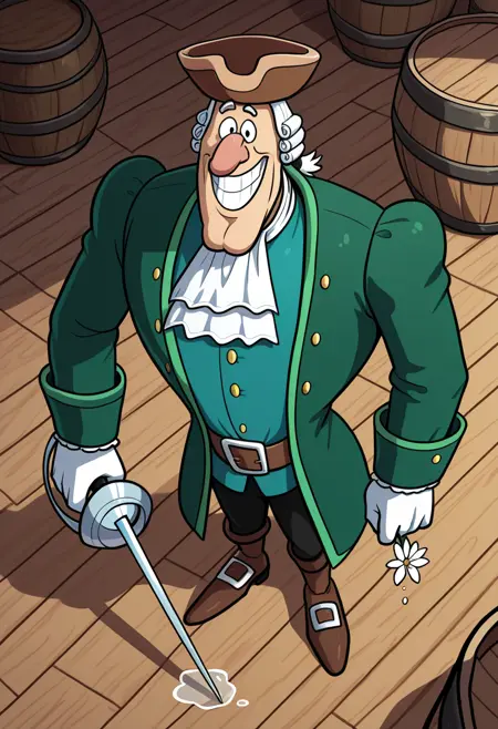 黒い目、ラピアを手に持つ、剣を手に持つ、花を手に持つ、花を嗅ぐ、ラム酒のボトルを手に持つ、握りこぶし、笑顔