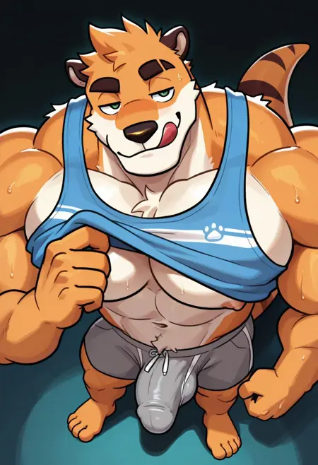 強化プロンプト:「ふァリー、縞模様の尻尾、縞、緑の目、オレンジ色の毛、筋肉質、男らしい、成熟した男性、バラ、胸の大きさの差異、大きな胸」