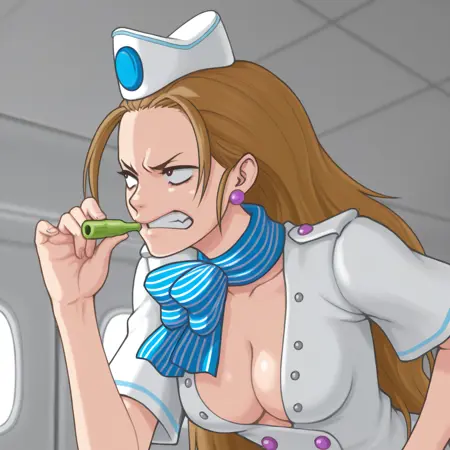 服装标签:空乘人员、空乘帽子、条纹围巾、白色铅笔裙、紫色耳环、白色高跟鞋