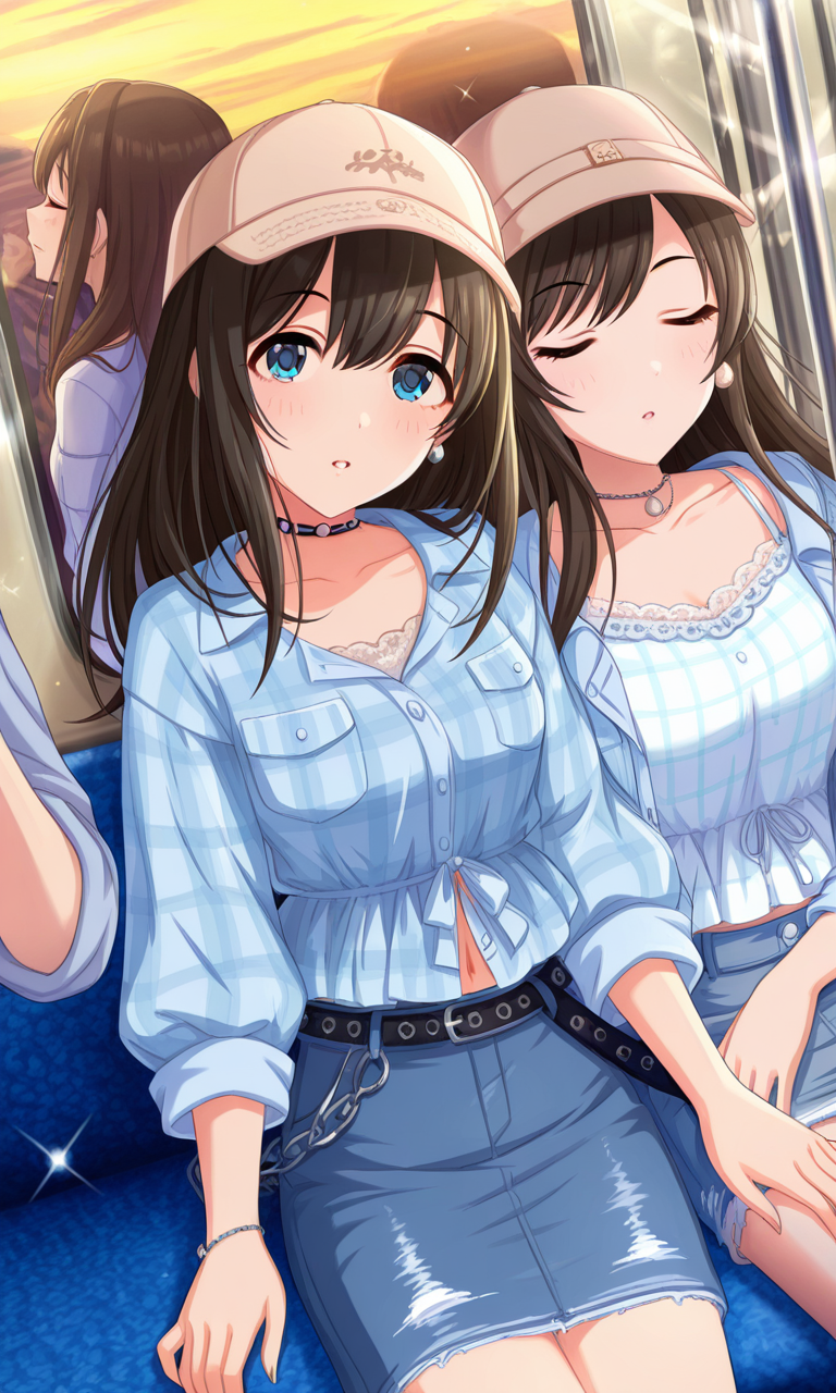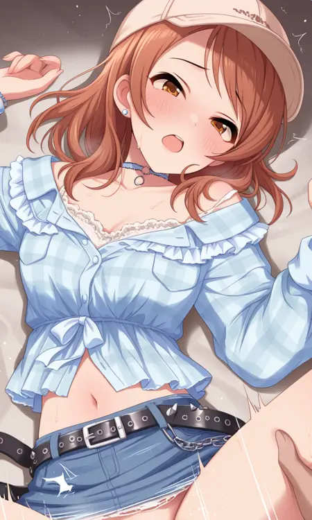 Sleep11Amana, beige_cap, blue_plaid_shirt, front_tie_top_shirt, long_sleeves, frilled_top, white_inner_lace, navel_baring, blue_denim_skirts, black_belt, studded_belt, choker, blue_ribbon_choker, casual_outfit, street_fashion,