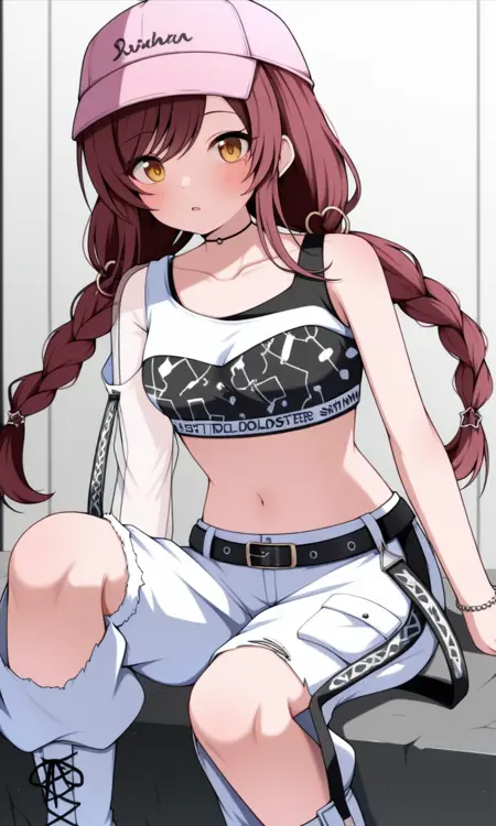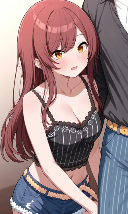 Sensei3Camisole, black_camisole_with_vertical_stripes_and_white_lace, crop_top, navel, midriff, collarbone, cleavage, blue_denim_shorts_with_yellow_mesh_belt,