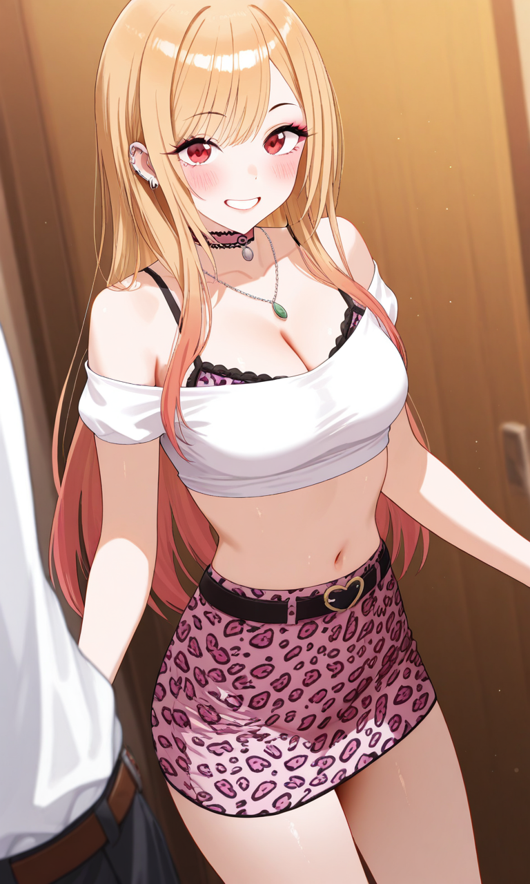 GAL9nure, necklace, inner_black_crop_top, white_off_shoulder, high_heels, belt, navel, midriff, jewelry, choker, pink_leopard_print_pencil_miniskirt,