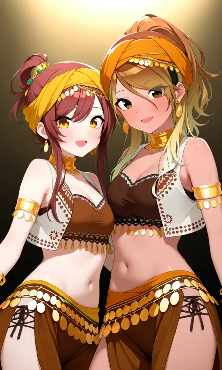 odoriko13dakedo, camel_colored_turban, very_short_white_sleevelss_jacket_with_arabesque_pattern, brown_bra, cleavage, jewelry, arabian_clothes, bellydancer, midriff, navel_baring, brown_dhoti,