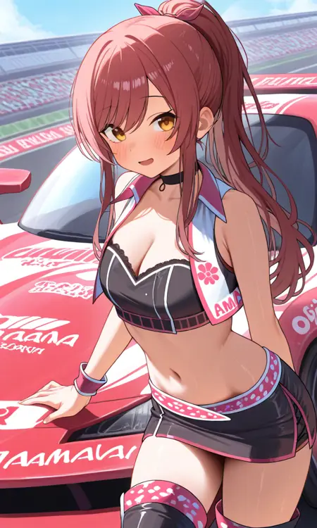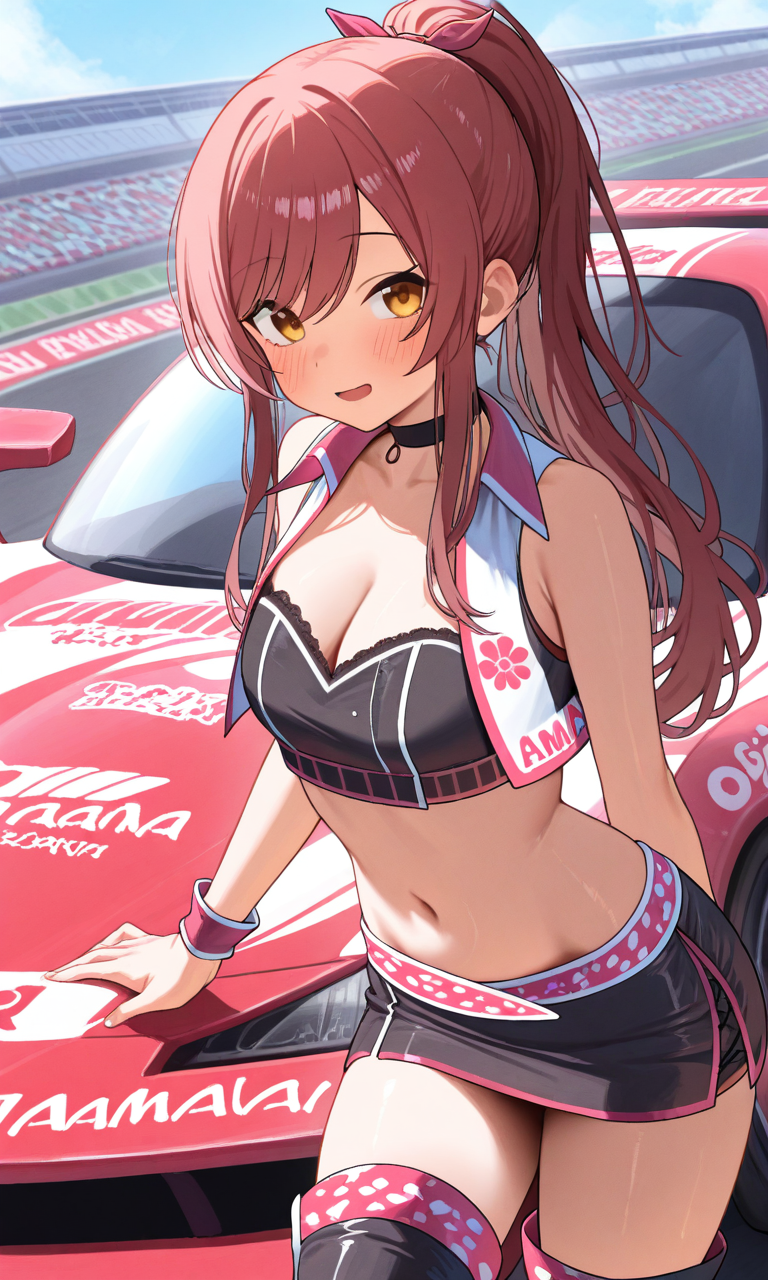 MT8RQ, race_queen, collared_short_sleeveless, flower_printed_sleeveless, black_bra, navel_baring, midriff, cleavage, thigh_boots, thighhighs, black_miniskirt, choker,