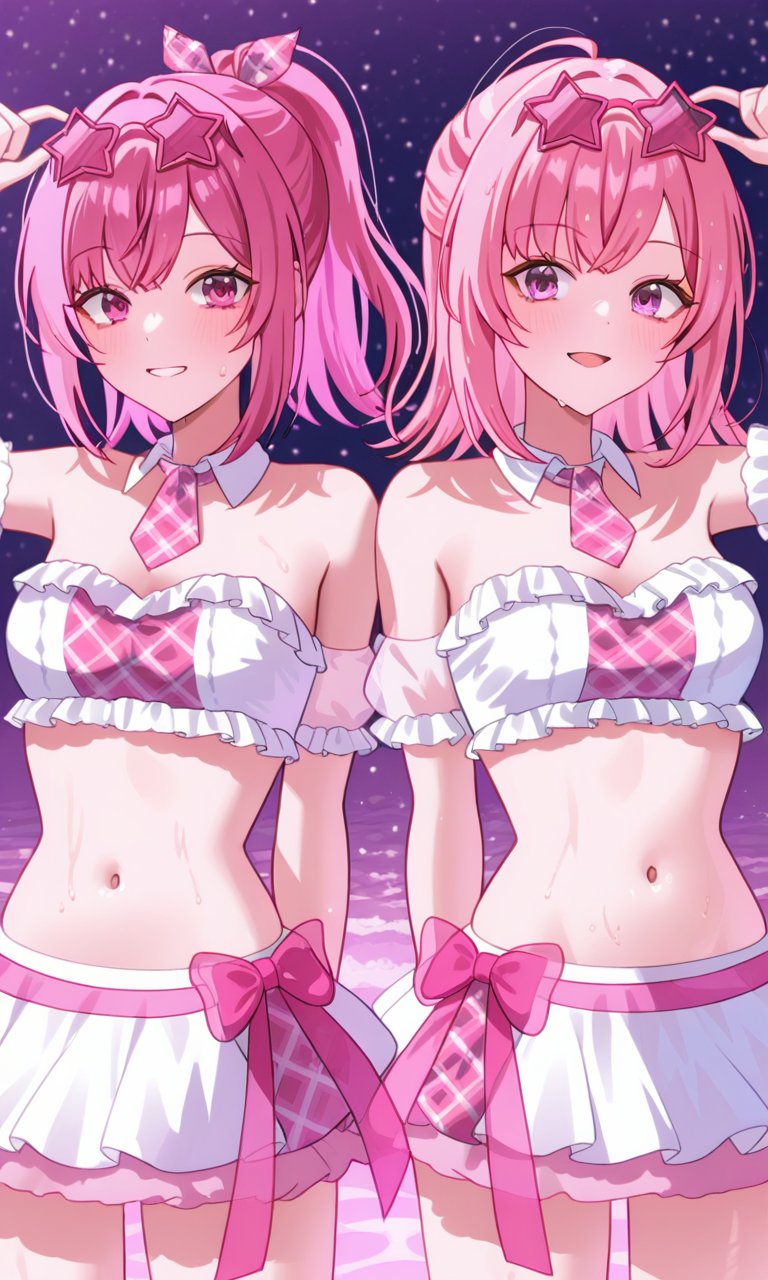 Splash4Party, pink_star-shaped_sunglasses_on_her_head, white_collar_with_pink_argyle_check_tie, pink_argyle_check_and_white_tube_top_ruffle_bikini, navel, midriff, pink_argyle_check_and_white_tube_top_frill_bikini_skirt_with_pink_ribbon_veil,