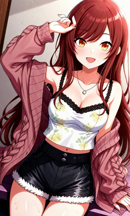 Wing5hiana5Camisole, casual_outfit, sleeveless_top, camisole, floral_print, lace_trim, multicolored_top, navel_baring, black_shorts, highwaist_shorts, frilled_shorts, cardigan, long_cardigan, loose_cardigan, pink_cardigan, fringe, necklace, casual_style,