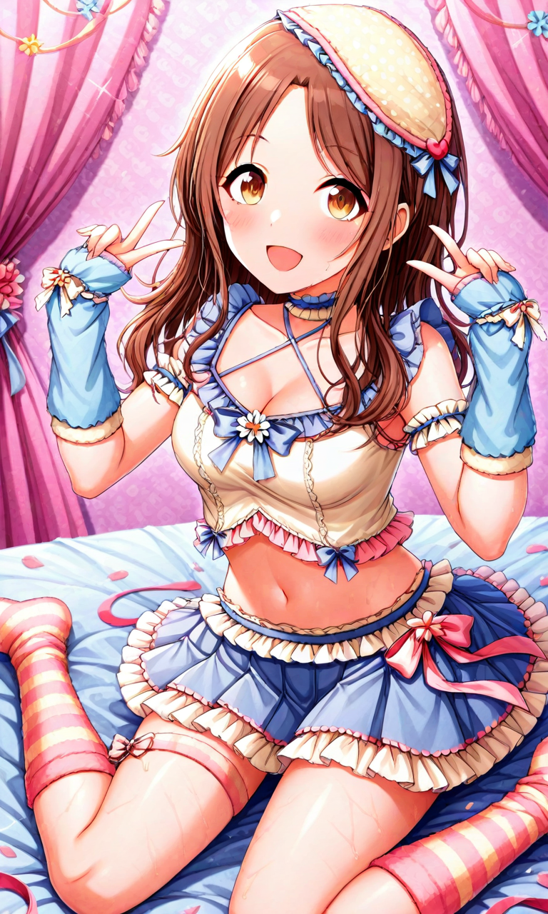 Yura6aqu6sta, idol_costume, pajama_style, headband, polka_dot_headband, flower_accessory, sleeveless, off_shoulder, frilled_top, ribbon_bow, blue_bow, navel, midriff, frilled_skirt, layered_skirt, blue_skirt, beige_frills, side_ribbon, thigh_ribbon, striped_legwear, leg_warmers, cute_costume, pastel_outfit, frills, multicolored,