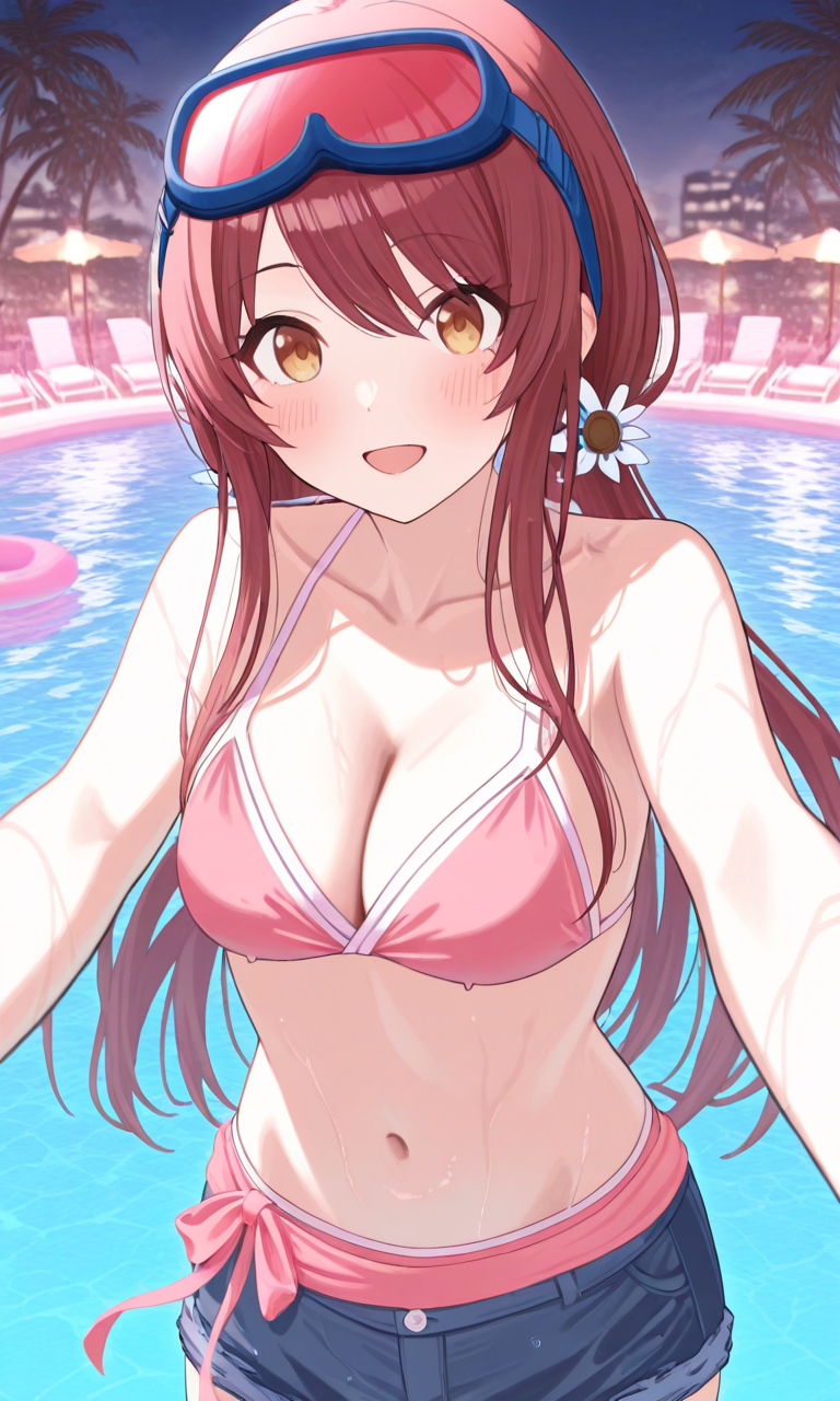 WPR, wear_goggles_on_head, cleavage, pink_bikini, navel, midriff, blue_denim_shorts_with_pink_ribbon,