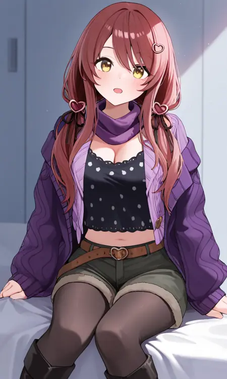 Yura7aqu7pv, heart-shaped_hair_clip, open_jacket, purple_jacket_with_cream_lining, long_sleeves, cleavage, black_inner_t-shirt_with_small_white_dots, navel_baring, midriff, black-green_shorts_with_belt, pantyhose, black_knee_boots,