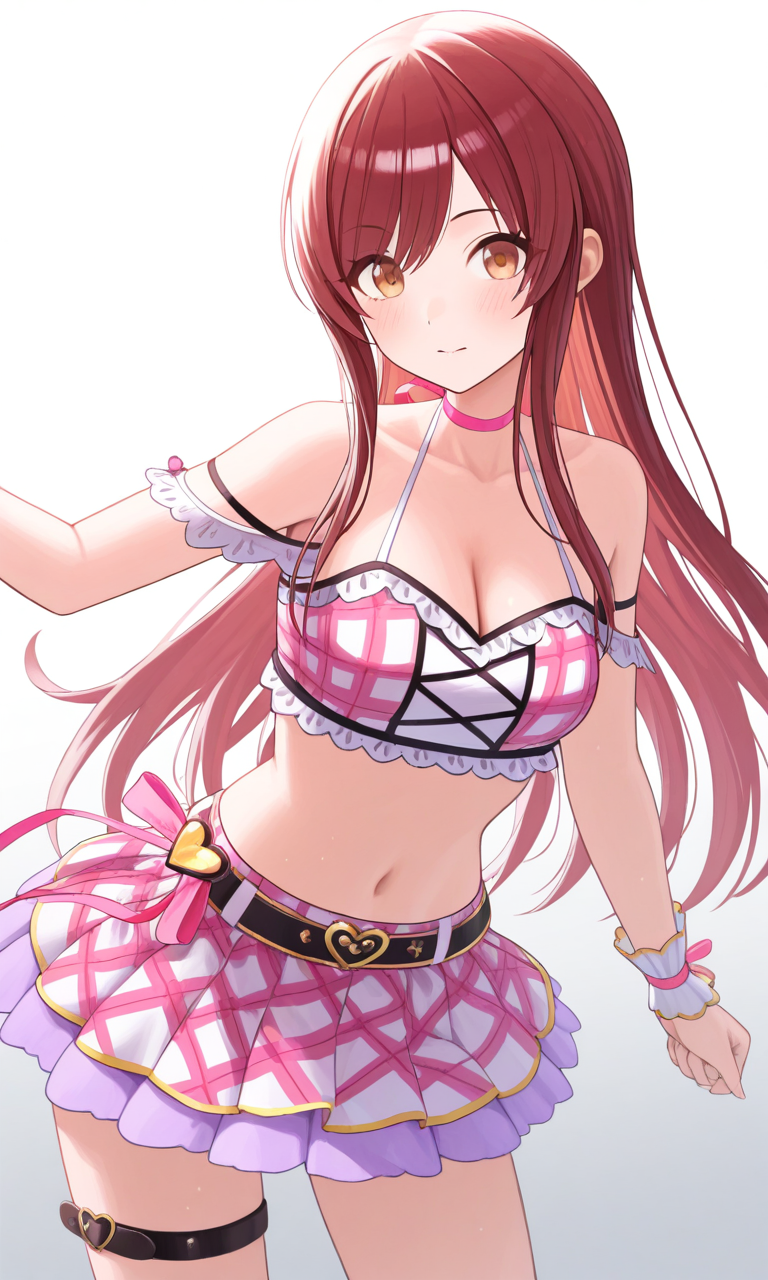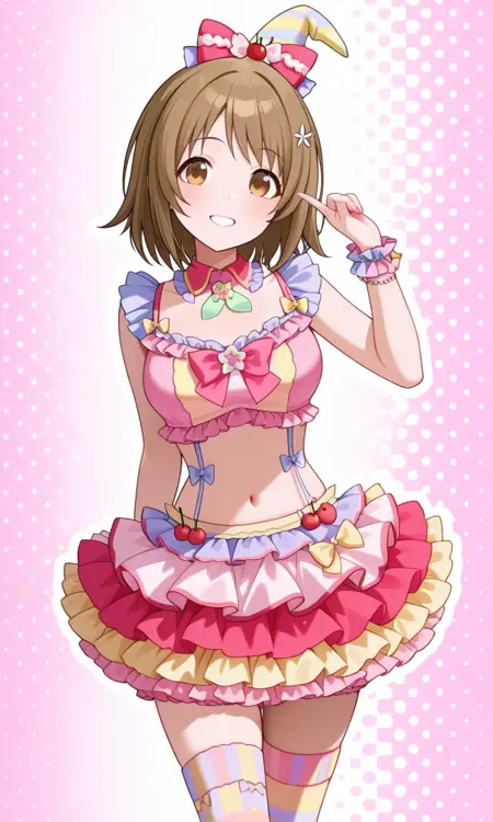 CTS, idol_costume, colorful_outfit, crop_top, frilled_top, sleeveless, pink_top, blue_frills, cherry_accessory, navel, midriff, frilled_skirt, layered_skirt, pink_skirt, red_skirt, yellow_frills, bow_accessory, striped_legwear, pastel_legwear, thighhighs, hair_accessory, mini_hat, candy_hat, bracelet, idol_style, cute_costume, ruffles, multicolored,