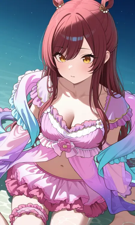 Otohime10Ryugu, osaki_amana, copper_hair, long_hair, half_up, yellow_eyes, lace_hagoromo_robe, pink_navel-baring_nightgown_with_one_flower_on_it, cleavage, bare_navel, navel-baring, midriff, flower_ornament, pink_ruffled_nightgown_skirt, layered_skirt, pink_scrunchie_on_one_thigh, thigh_garter, ribbon_garter,