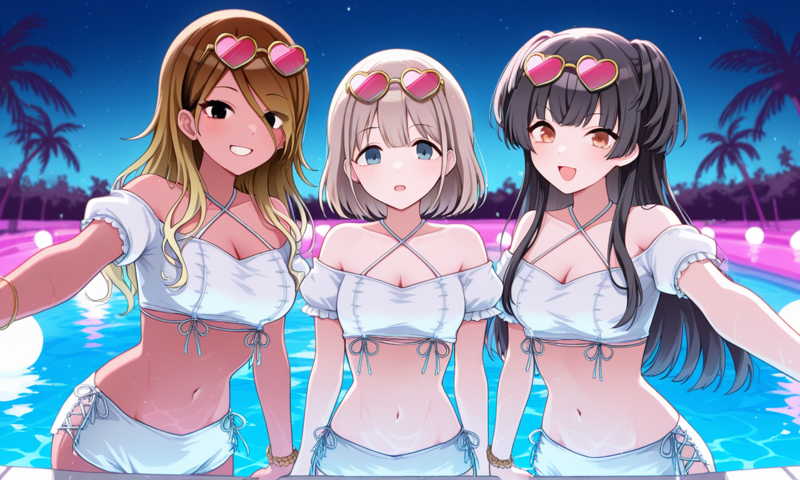 Chiyu12Diama, pink_heart-shaped_sunglasses_with_gold_frames_resting_on_head, cleavage, white_voluminous_short_sleeves_and_laced_cross_halter_crop_top_off-the-shoulder_bikini, navel, midriff, white_side-laced_cross_short_bikini_bottoms,