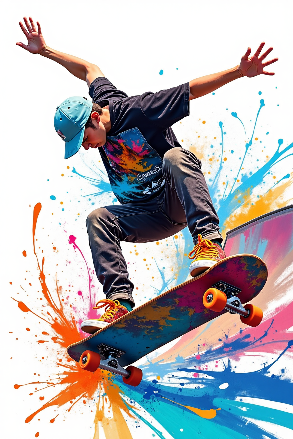 ベースプロンプト: スケートボードアクションと飛び散る色