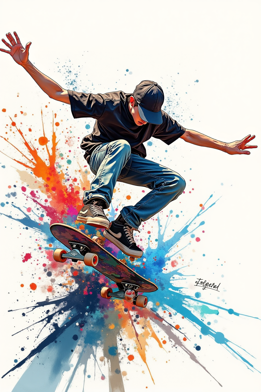 1. スケートボードアクションと飛び散る色、ダイナミックなポーズ、鮮やかな色調、都市の背景、芸術的な筆致、ストリートスケート文化のエネルギーを捉える。