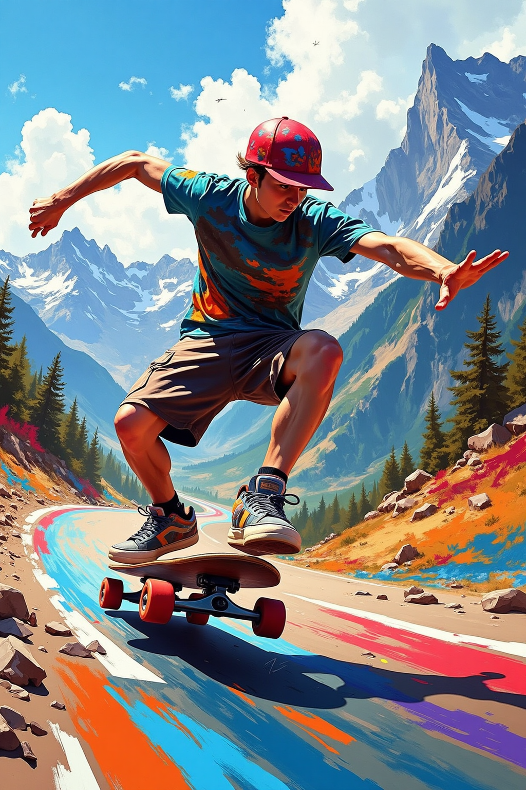 6. スケートボードアクションと飛び散る色、下り坂でのスピード、大胆な色のストリーク、山道の背景、油絵の質感、スリルを伝える。
