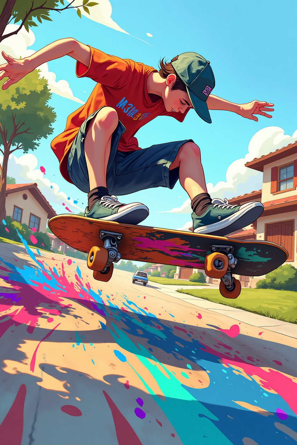 10. スケートボードアクションと飛び散る色、ノリーキックフリップ、明るい色の飛び散り、郊外のドライブウェイ、カートゥーンアニメーションスタイル、遊び心を生み出す。