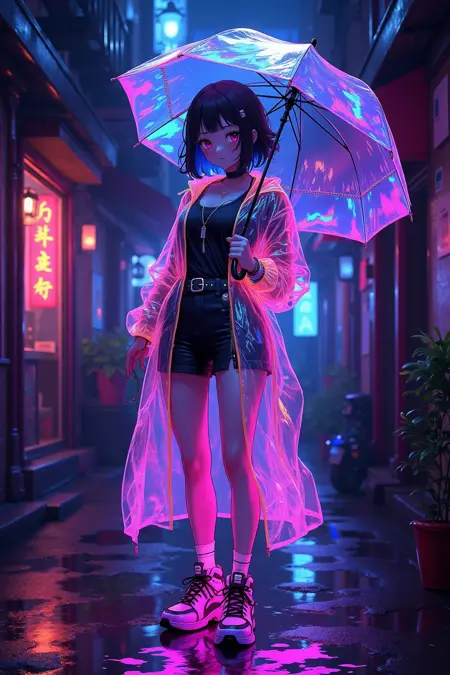 네온 컬러 및 사이버펑크 스타일, 투명한 네온 라인으로 장식된 레인코트를 입은 소녀, 홀로그래픽 우산을 들고, 네온불이 가득한 골목에 서 있음, 웅덩이에 빛이 반사됨.