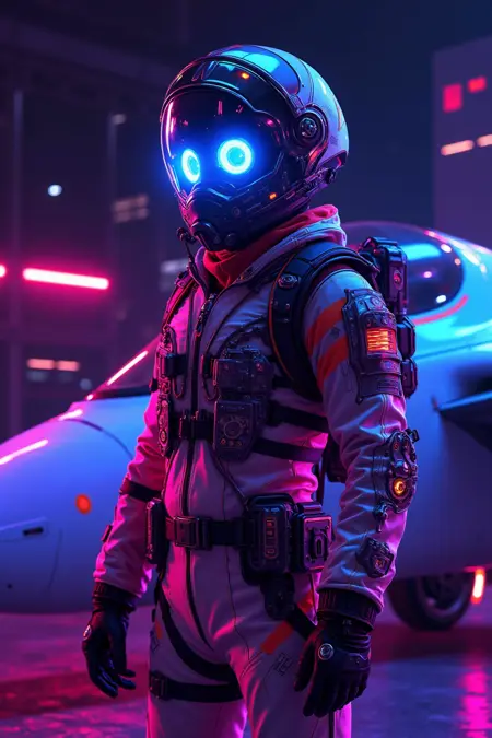 霓虹色与赛博风格,飞行员身着霓虹装饰的飞行服,头盔配备发光面罩,站立在一台未来战机旁,机库被霓虹灯照亮。