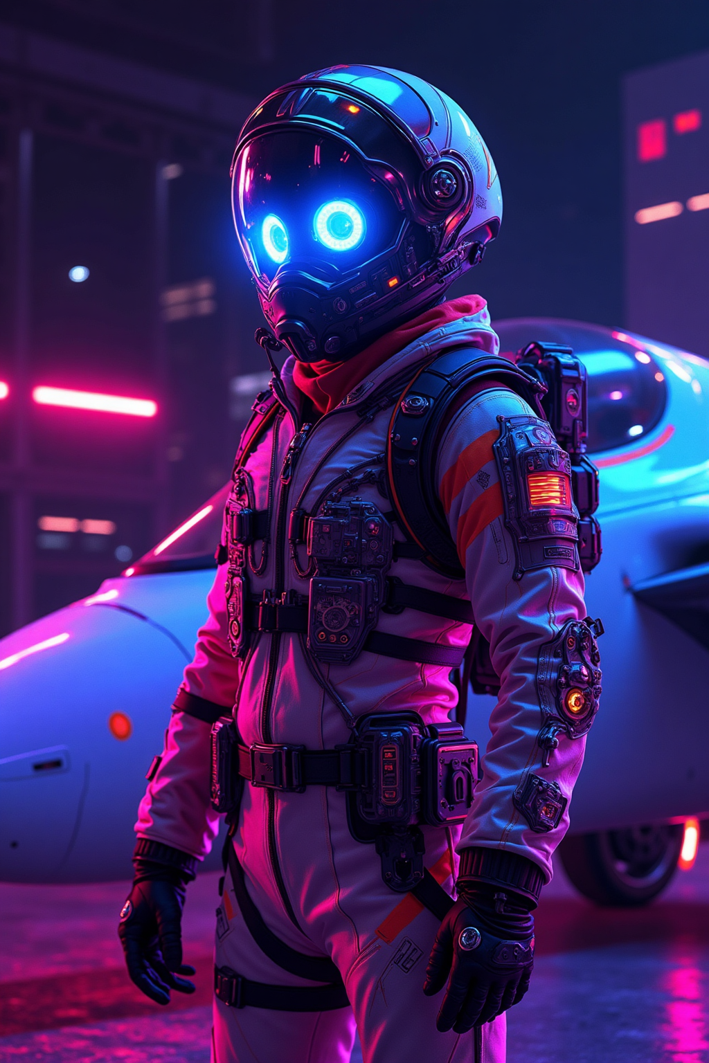 네온 컬러 및 사이버펑크 스타일, 네온 악센트가 있는 비행복을 입은 조종사, 빛나는 헬멧 시야각, 미래형 항공기 옆에 서 있음, 네온불이 켜진 헙거.