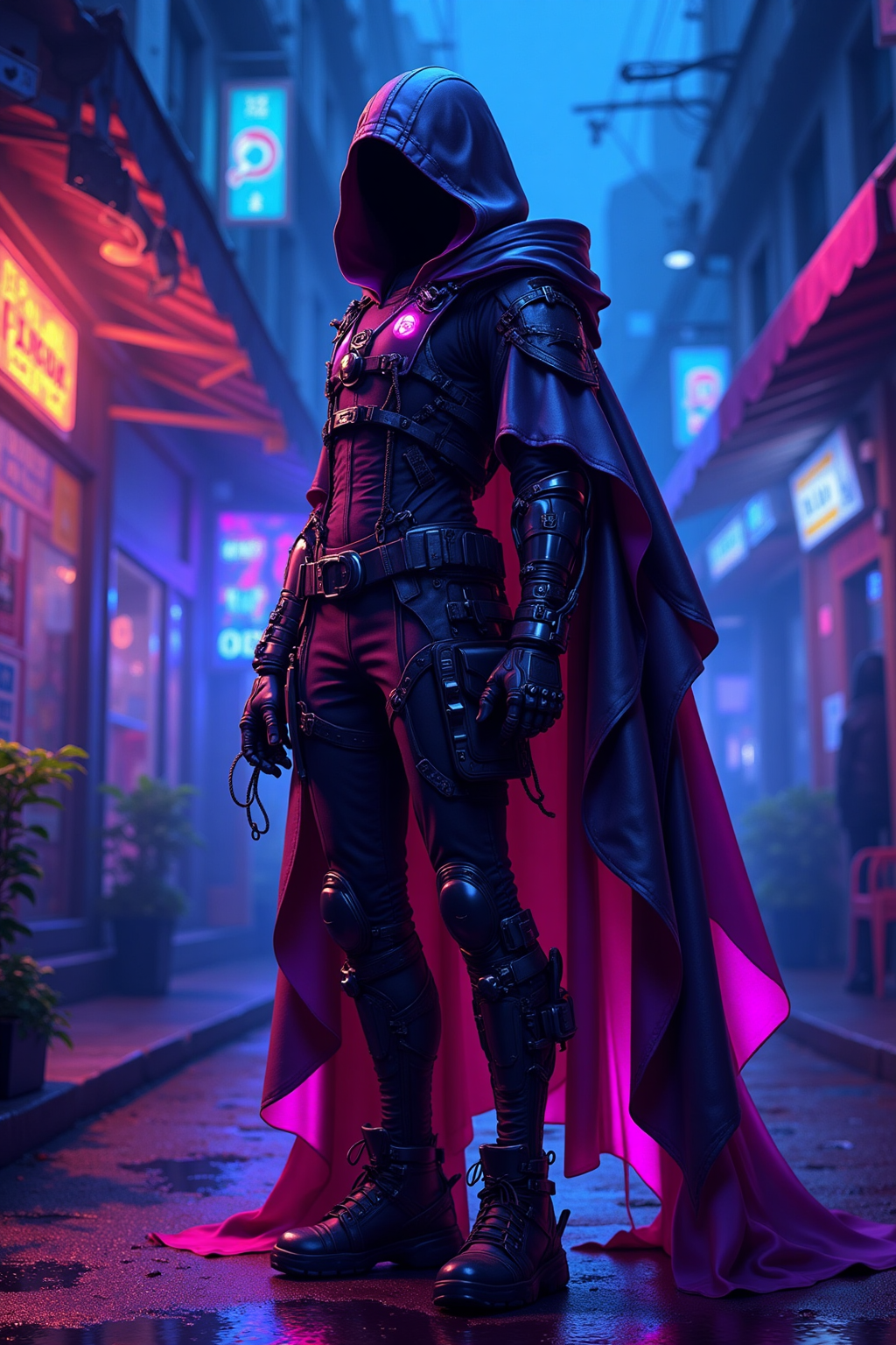 네온 컬러 및 사이버펑크 스타일, 후드 달린 망토를 입은 인물, 망토 가장자리가 네온빛으로 빛나고, 사이버네틱 팔, 네온불이 켜진 거리 모퉁이에 서 있음, 안개 낀 배경.