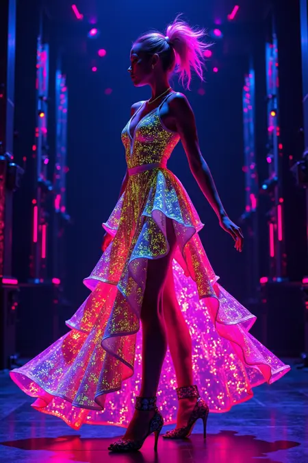 霓虹色与赛博风格,舞者身着飘逸的霓虹色长裙,裙面图案如电路板,背景为闪烁灯光的高科技舞台,呈现剪影效果。