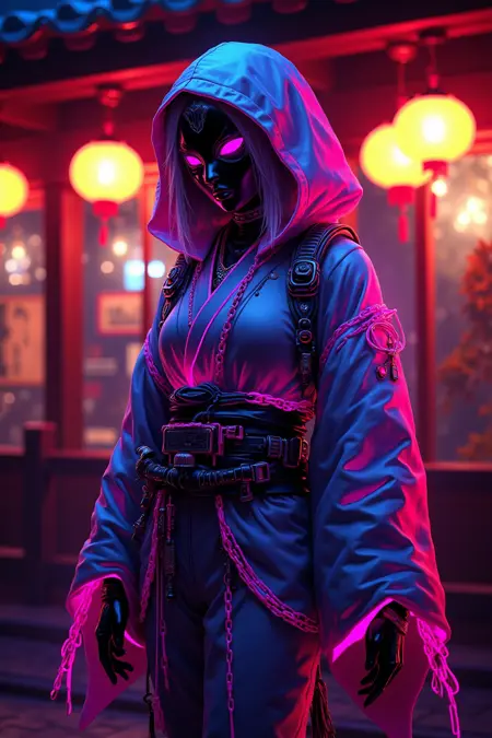 네온 컬러 및 사이버펑크 스타일, 네온 트림이 된 기모노를 입은 신비로운 인물, 마스크 착용, 전통적인 스타일의 사이버 차관에서 서 있음, 빛나는 등불.