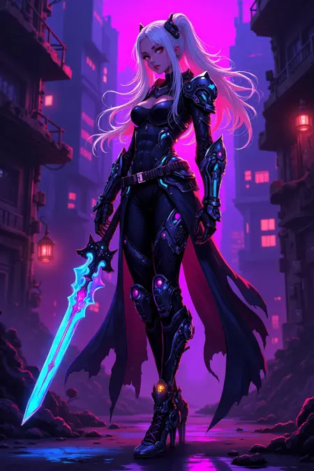 霓虹色与赛博风格,长发发光的角色,身着带有霓虹装饰的未来装甲,手持等离子剑,身处废弃的赛博城市中。
