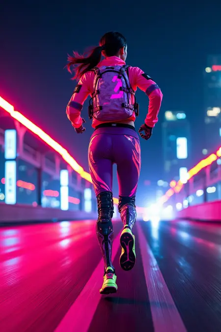霓虹色与赛博风格,跑者身穿霓虹条纹运动服,配备义肢双腿,在霓虹照亮的高速公路上飞奔,运动模糊表现速度。