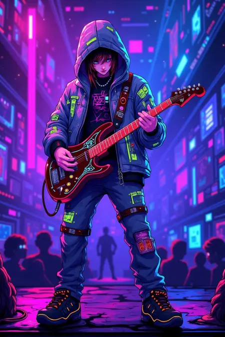 霓虹色与赛博风格,音乐家手持霓虹灯光吉他,身穿像素艺术图案夹克,在漂浮的赛博舞台上表演,观众为发光虚拟形象。