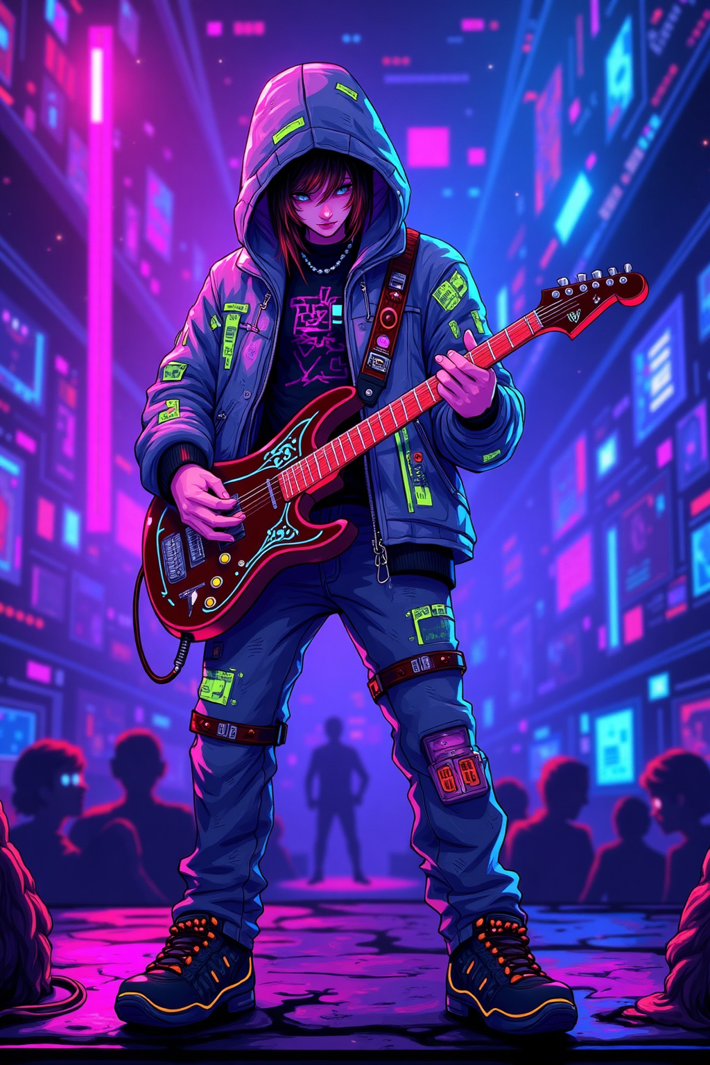네온 컬러 및 사이버펑크 스타일, 네온불이 켜진 기타를 연주하는 뮤지션, 픽셀 아트 무늬가 있는 재킷 착용, 떠 있는 사이버 무대에서 공연 중, 관객은 빛나는 아바타들.