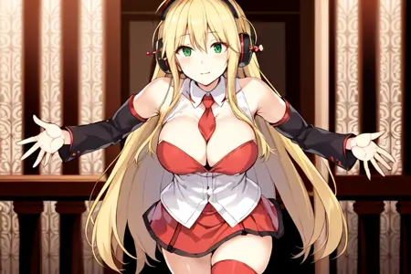 示例:blonde very long hair, antenna hair, headphones, hair ornament, green eyes, red necktie, bare shoulders, detached sleeves, cleavage, red skirt, single thighhigh,